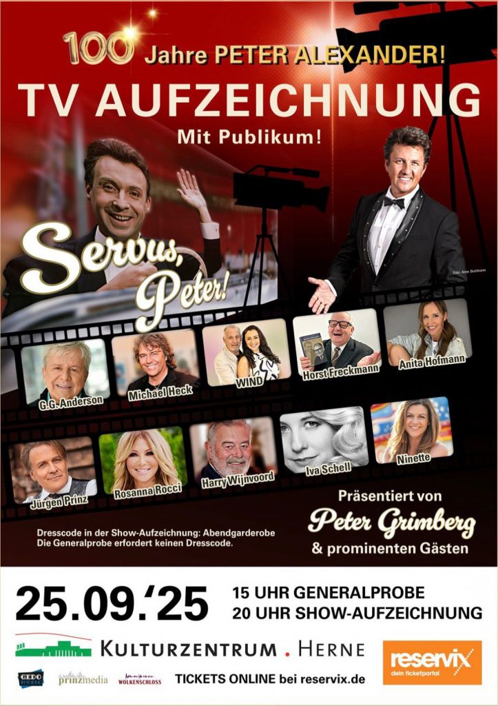 Anlässlich des 100. Geburtstags der unvergessenen Showlegende Peter Alexander präsentiert Peter Grimberg eine glanzvolle Hommage – stilecht als große TV-Aufzeichnung mit prominenten Gästen und musikalischem Hochgenuss. Freuen Sie sich auf einen Abend voller Nostalgie, Witz und Gefühl, wenn Peter Grimberg gemeinsam mit Stars wie Chris G.G. Anderson, Rosanna Rocci, WIND, Michael Heck, Iva Schell, Jürgen Prinz, Anita Hofmann, Horst Freckmann, Ninette, Harry Wijnvoord und weiteren Weggefährten sowie Überraschungsgästen die größten Hits von Peter Alexander zum Leben erweckt.